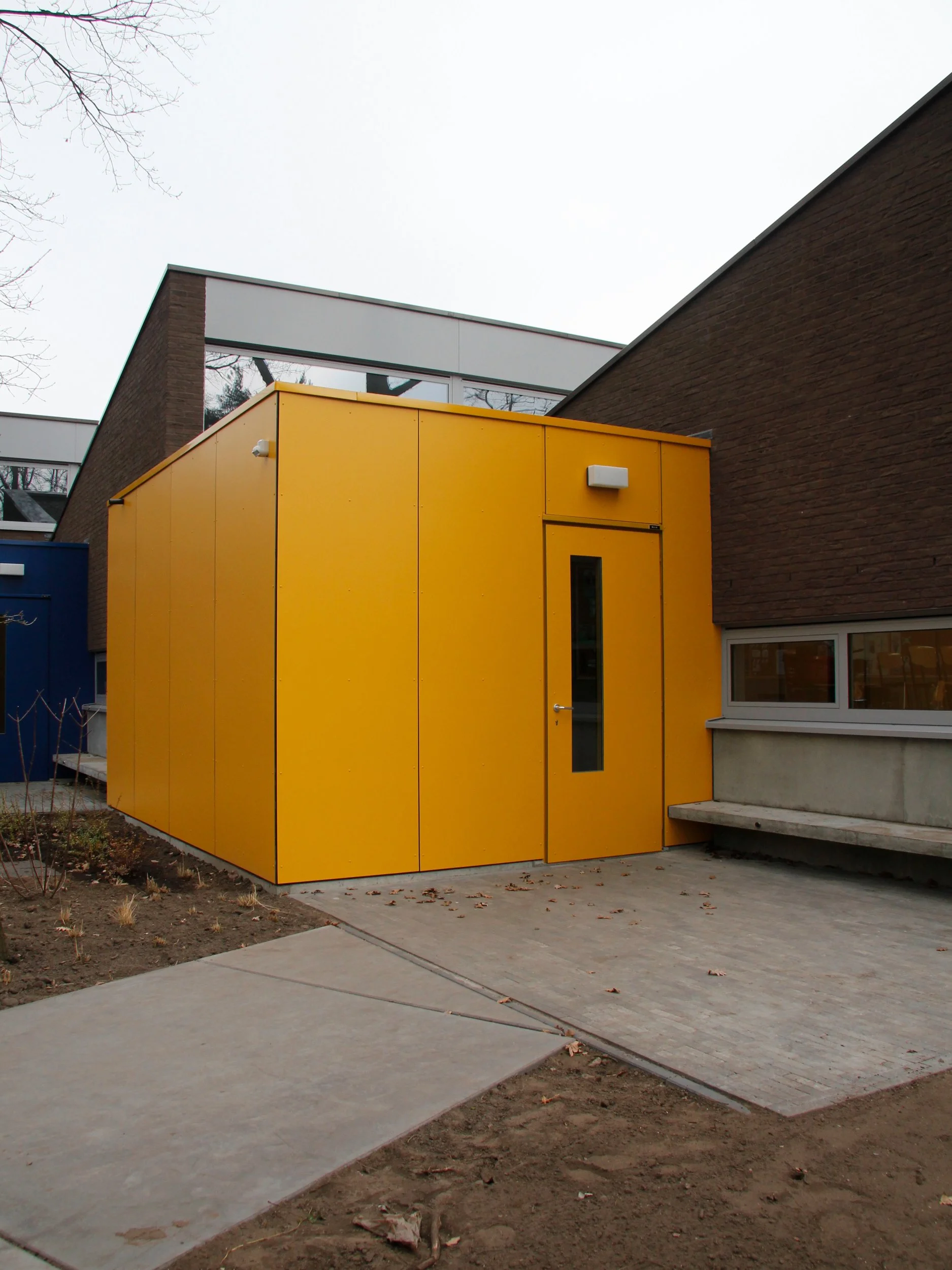 Het nieuwe sanitair gebouw vervangt een verouderd volume uit de jaren vijftig en vormt een helder, functioneel baken aan de rand van de speelplaats. De uitgesproken dakvorm sluit aan op de schaal van de klaslokalen en laat overvloedig daglicht binnen. De eenvoud en materiaalkeuze geven het paviljoen een speels maar rustig karakter dat zich vanzelf in de omgeving voegt.